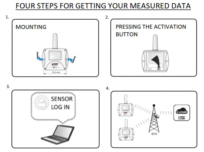 Mierzone wartości są wysyłane z ustalonym interwałem (10 min do 24 h) za pomocą transmisji radiowej w sieci Sigfox do chmury Comet, w której użytkownik może przeglądać dane za pomocą komputera lub urządzenia mobilnego.